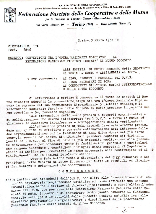 3 marzo 1931: circolare che riporta in oggetto "Convenzione tra l'Opera Nazionale Dopolavoro e la Federazione Nazionale Fascista Società di Mutuo Soccorso", come da documento seguente.