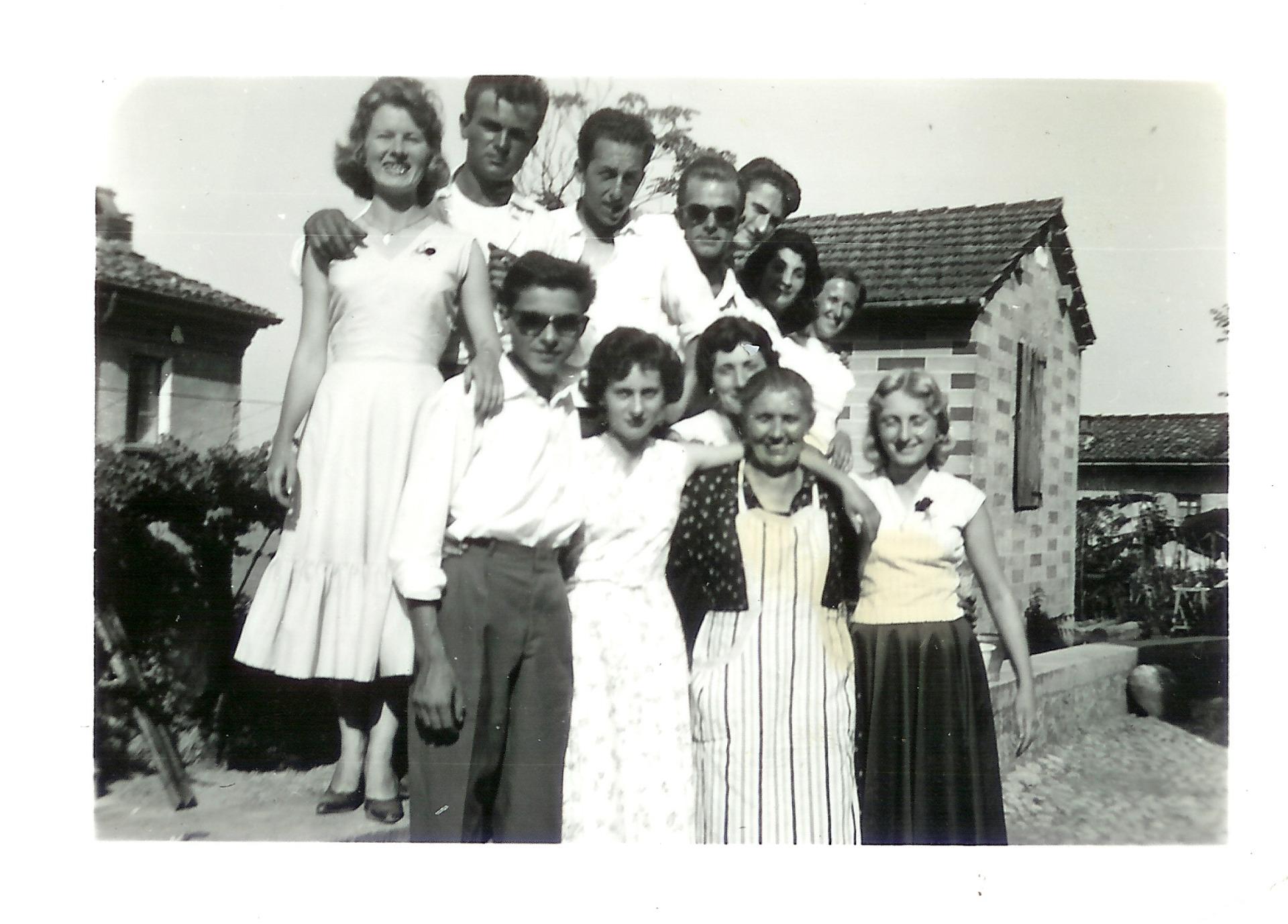 In prima fila, in piedi, da sinistra: Giovanni (Nino) Sedano, Rita Mogni, Maria Mogni, la cuoca, Marisa Ferrari; in seconda fila, in piedi: Fausta Casanova, Dallocchio, Giuseppino Casanova, Pietro Casanova, Gian Franco Fascetto, Galeotta Carmen, Bice Casanova. La foto è stata scattata di fronte alla casa di Giuseppino Casanova.