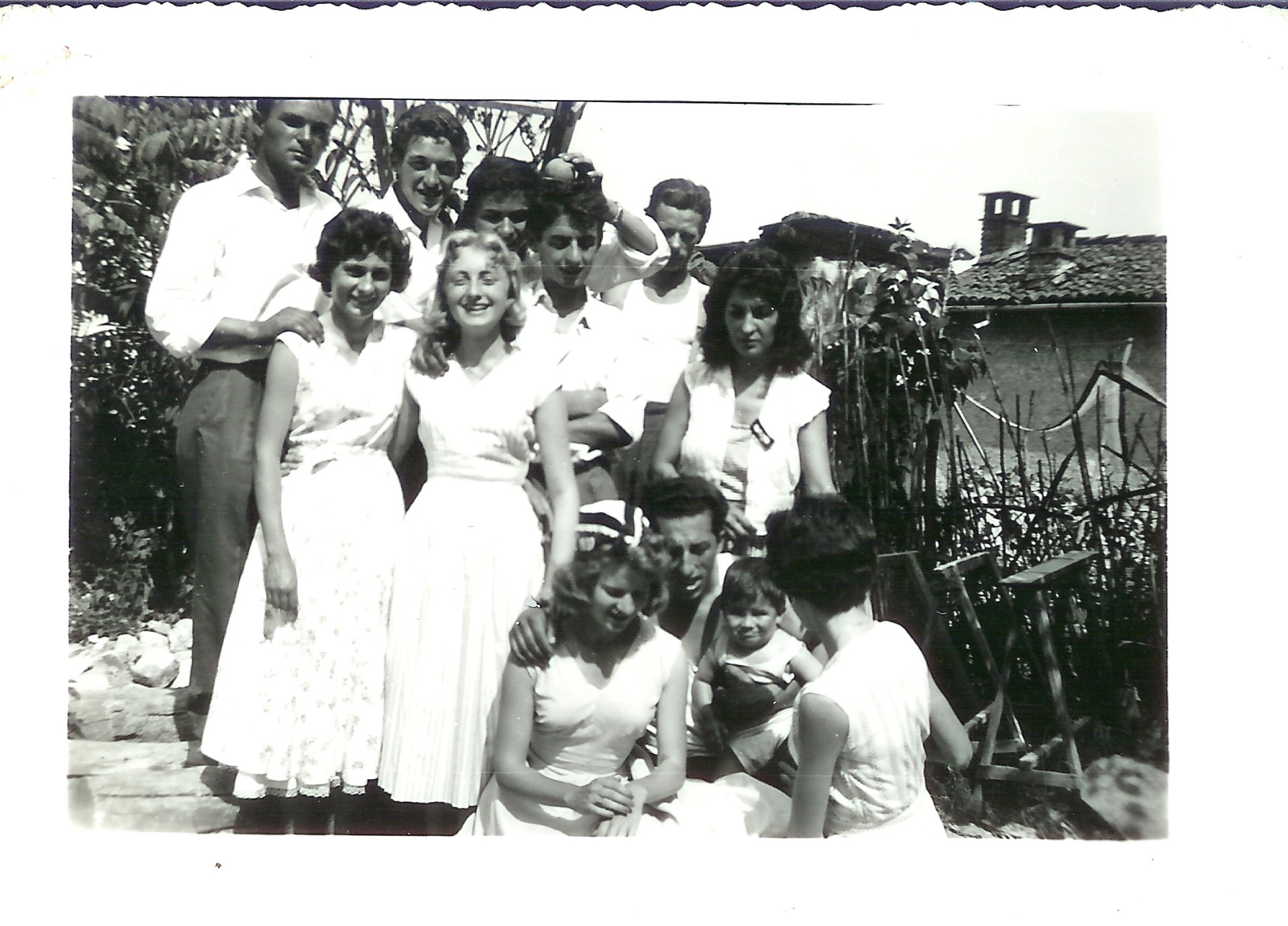 In primo piano, da sinistra: Fausta Casanova, Giuseppino Casanova con in braccio Luigi Casanova; in prima fila, in piedi, da sinistra: Rita Mogni, Marisa Ferrari, Sergio Moret, Galeotta Carmen; in seconda fila, in piedi: Dallocchio, Lino Fascetto, Giovanni (Nino) Sedano, Antonio (Tonino) Zuccarelli. La foto è stata scattata di fronte alla casa di Giuseppino Casanova.