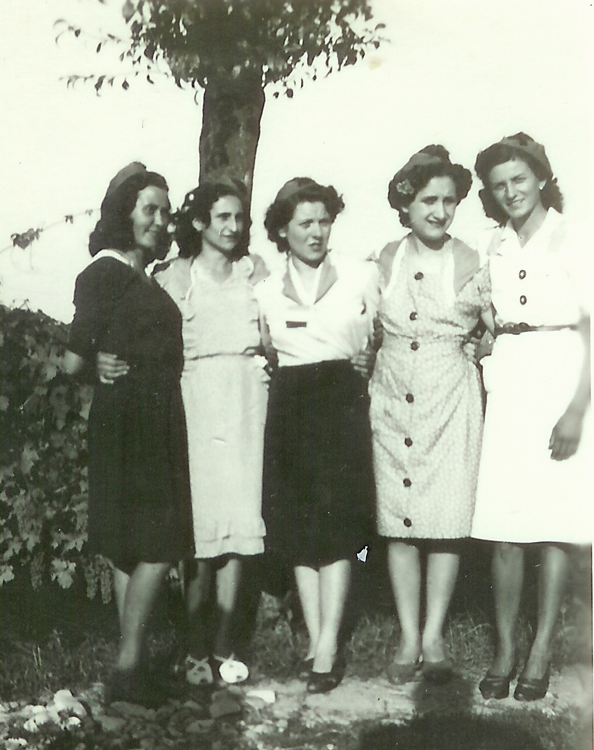 1947: le coscritte della classe 1927: da sinistra: Gina Zuccarelli, Bruna Pelosi, Pinuccia Carrù, Rita Bettaglio, Angela Mogni (dall'archivio fotografico di Eugenia Pareto).