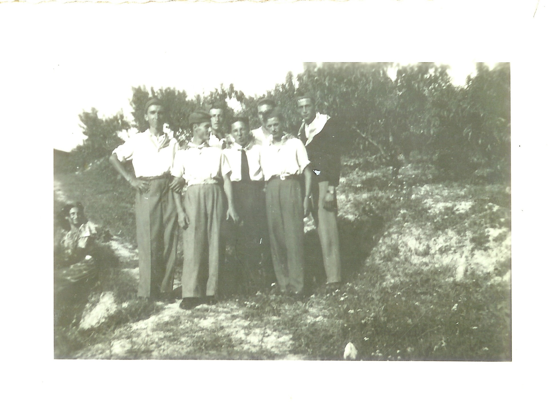 1947: i coscritti della classe 1927: "Il 7 Bello di Monleale". In piedi, da sinistra: Mario Casanova, Aldo Rolandi, Augusto Massa, Alfonso Massa; seduti, da sinistra: Antonio (Tonino) Zuccarelli, Ulisse Zuccarelli, Diego Zuccarelli (dall'archivio fotografico di Eugenia Pareto).