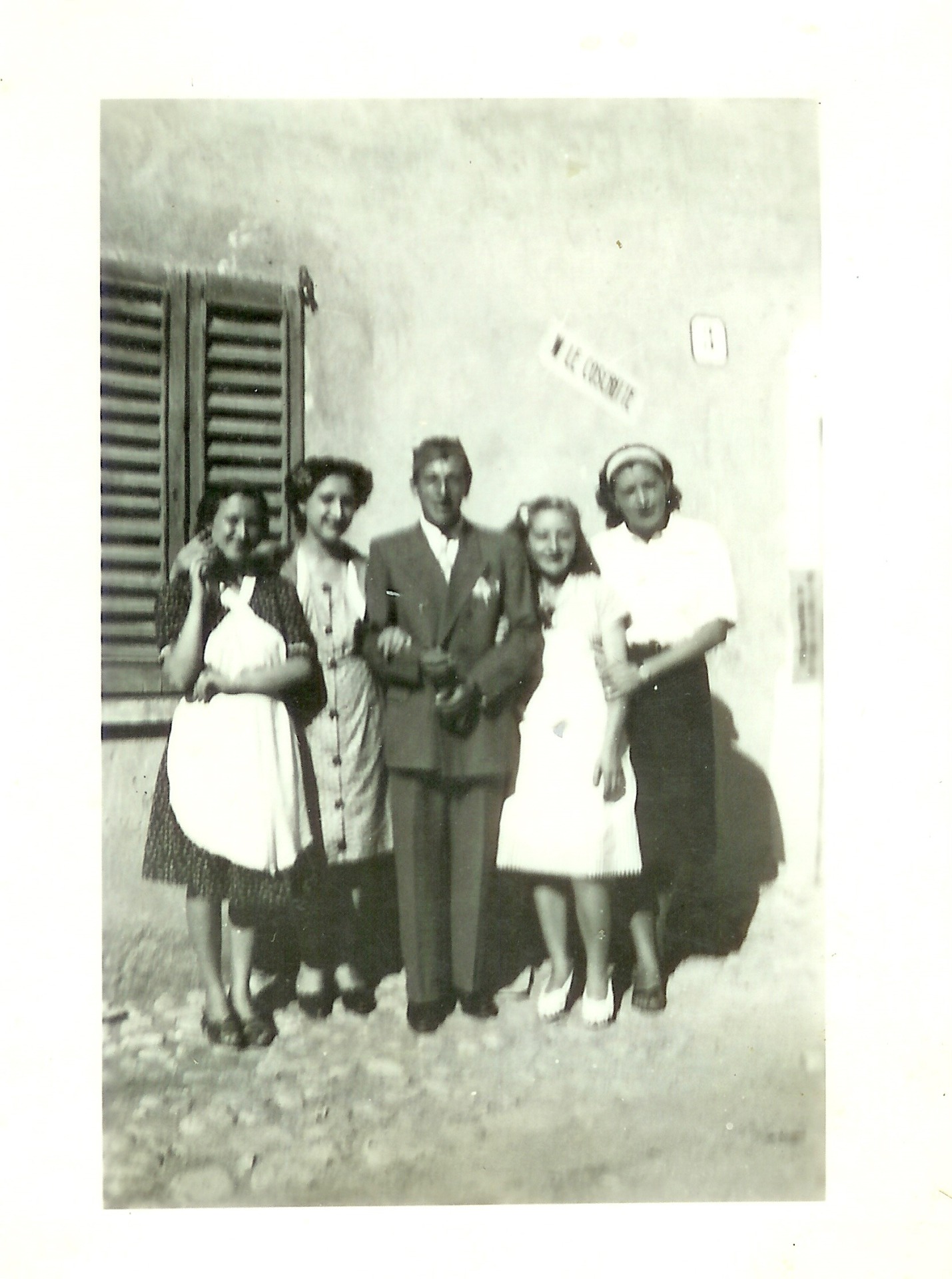 1947: il coscritto Mario Casanova, posa davanti alla propria casa con la coscritta Rita Bettaglio (a braccetto di Mario, a sinistra), invitata al pranzo, come era consuetudine, e con le "cuoche" e "cameriere", ragazze del paese che si sono prestate, per l'occasione, a dare una mano per la preparazione: da sinistra, Maria Pia Fascetto, Giovanna Fascetto. Sullo sfondo, attaccata al muro, si può vedere la scritta "W le coscritte" (dall'archivio fotografico di Eugenia Pareto).
