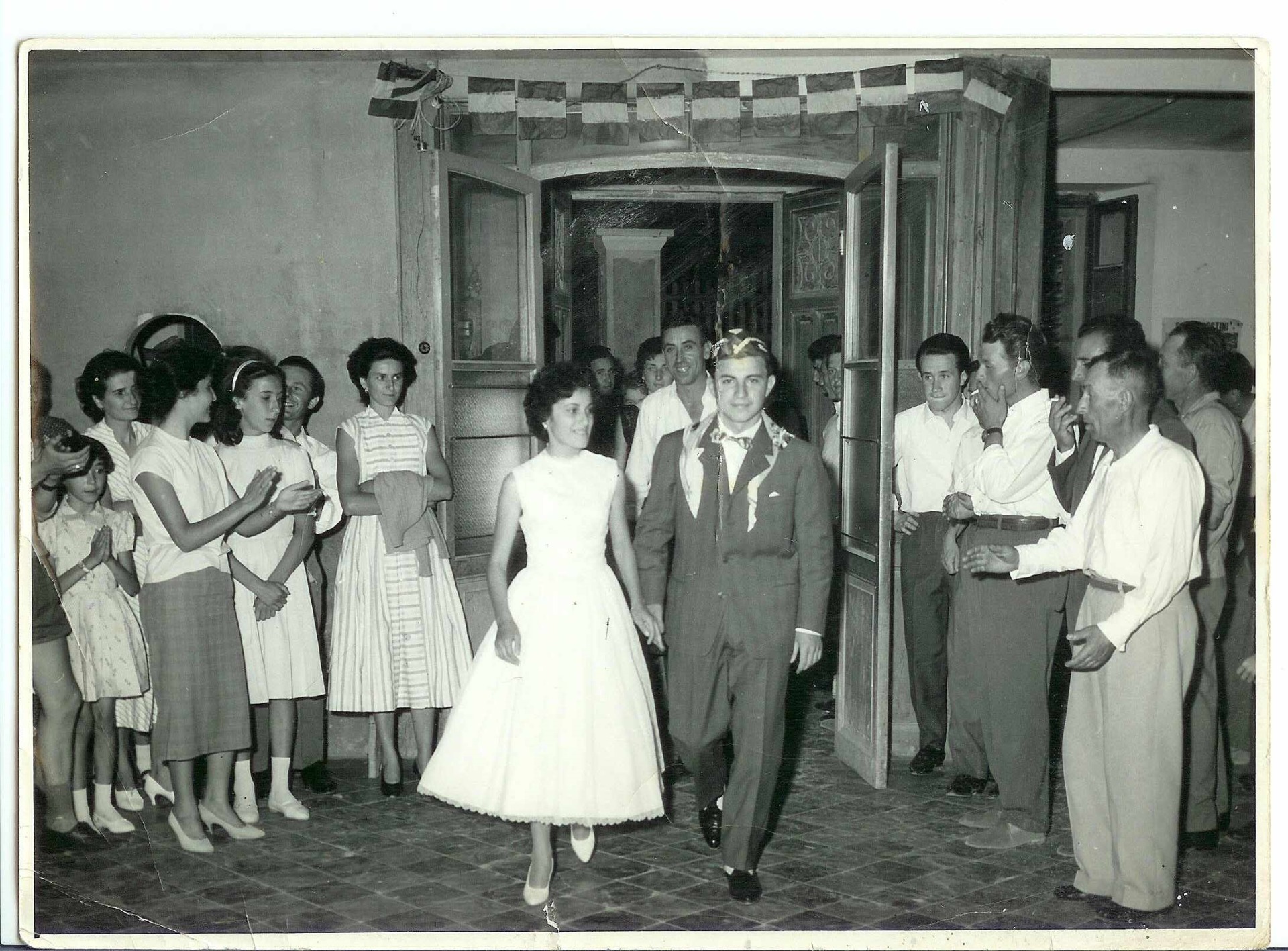 1957: l'ingresso nella sala della Saoms dei coscritti classe 1937 per la sfilata. In primo piano: Mariuccia Chiesa e Pier Francesco Scherpa; dietro ai due coscritti, si riconoscono: Maria Mogni e Gigi Zuccarelli; tra il pubblico, da sinistra, si riconoscono: Maria Costanza Taverna (bambina con vestito a fiori), Sonia coniugata Boveri, Renato Boveri, Angela Mogni, Ambrogio Boveri, Igino Scherpa (dall'archivio fotografico di Mariuccia Chiesa).