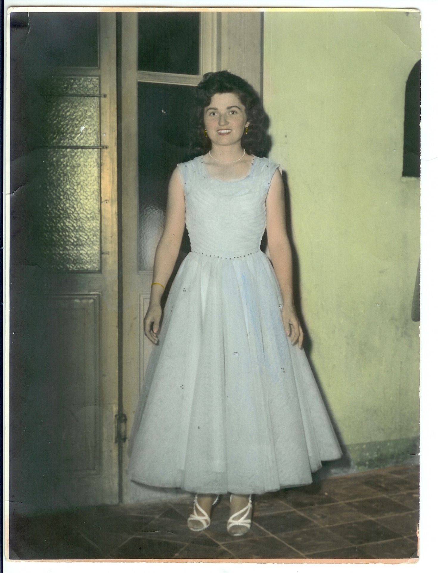 1957, il ballo per la festa dei coscritti classe 1937: Ernestina Boveri davanti alla porta della SAOMS (dall'archivio fotografico di Genesio ed Ernestina Boveri.),