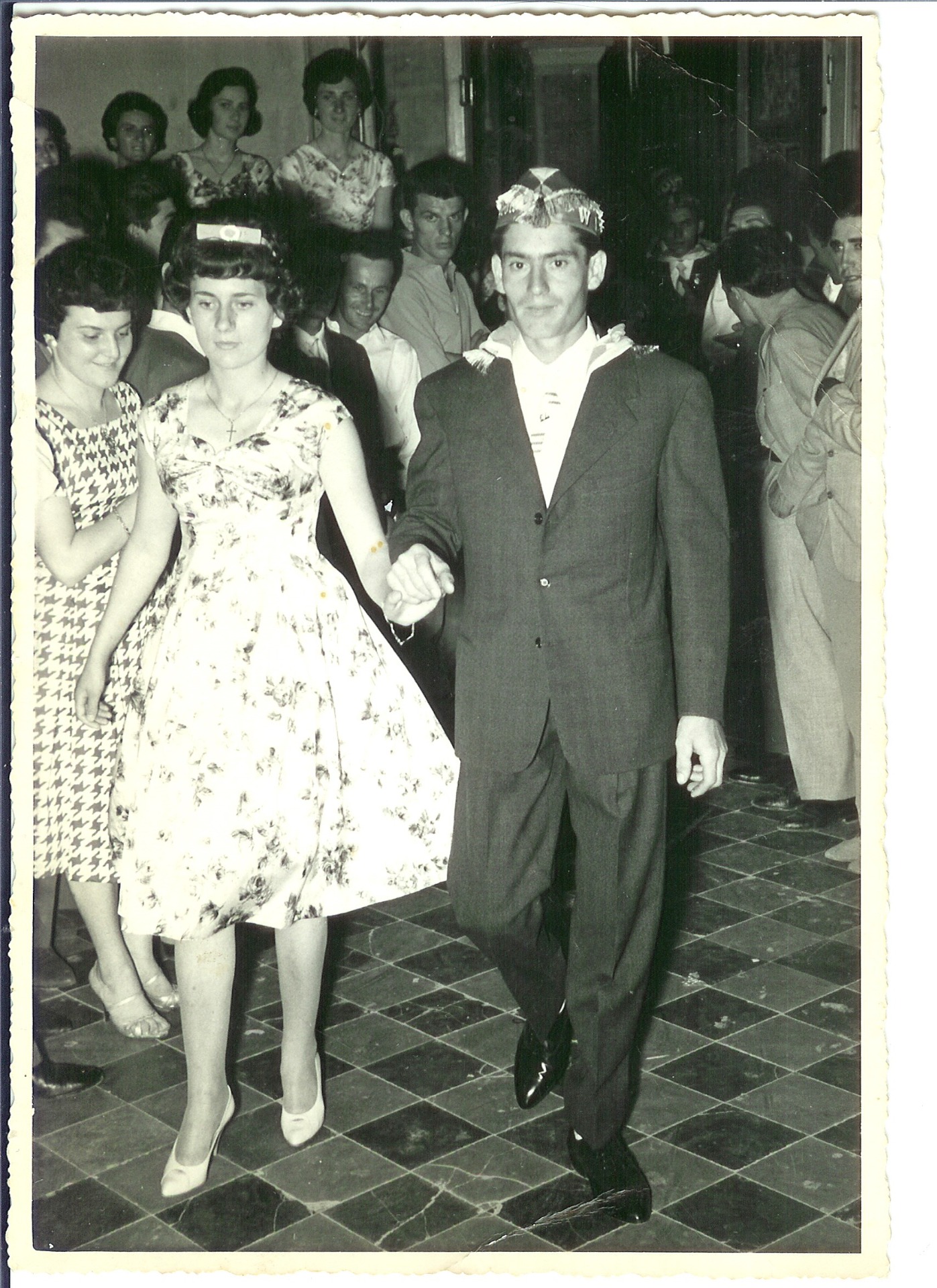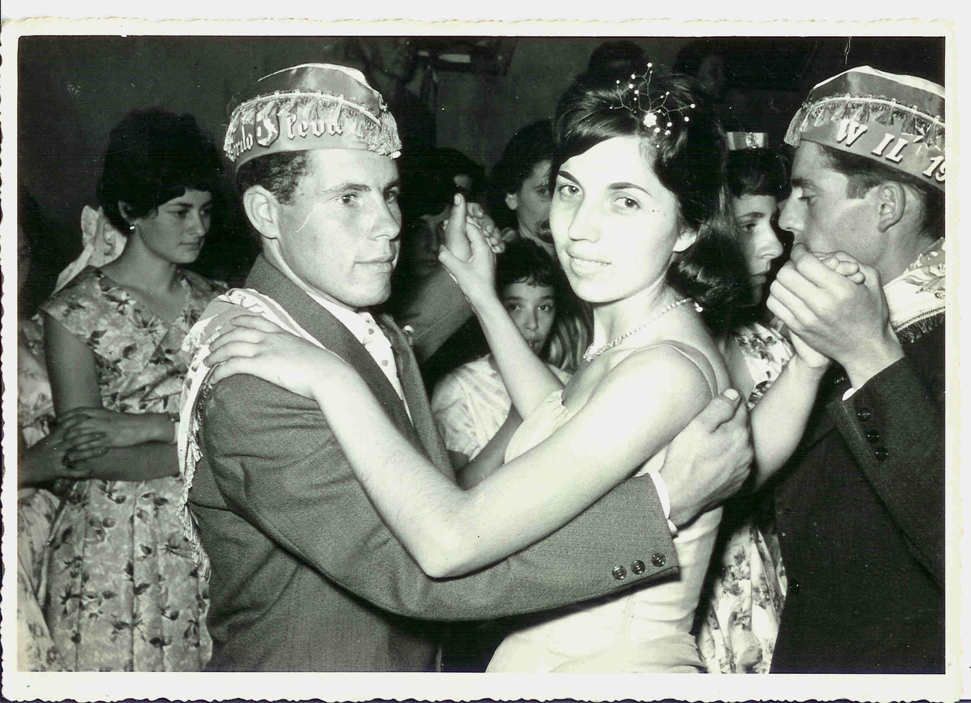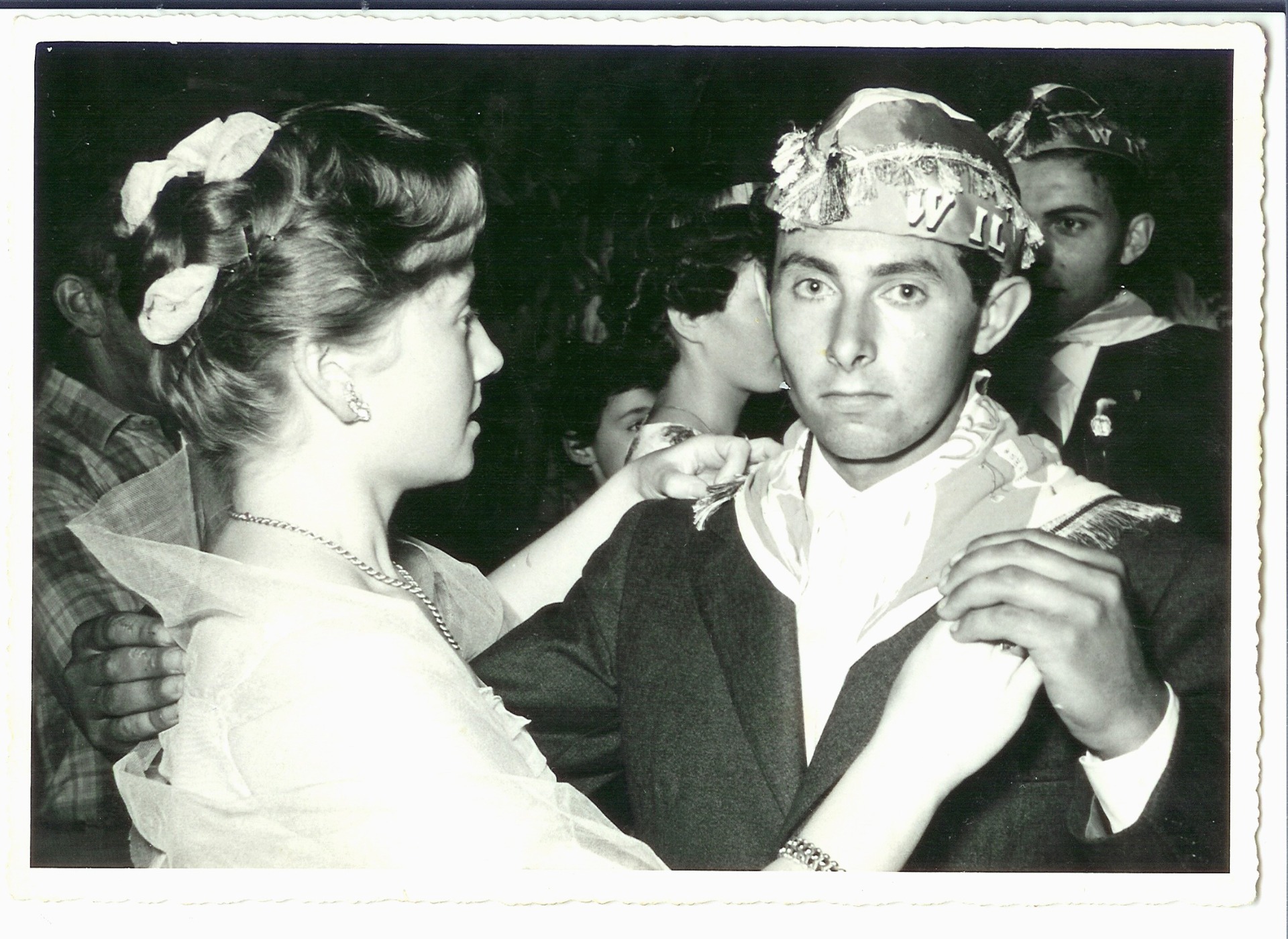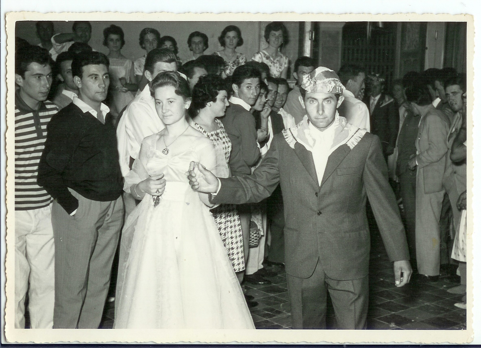 1959: festa dei coscritti classe 1939: la sfilata delle coppie per l'ingresso nella sala della Società. In primo piano: Franca Massa e Giovanni (Nino) Sedano; sullo sfondo, tra il pubblico, si riconoscono: Renato Boveri, Antonio (Tonino) Zuccarelli, Pierina Roveda, Gigi Zuccarelli, Ulisse Zuccarelli (dall'archivio fotografico di Wanda Sedano).