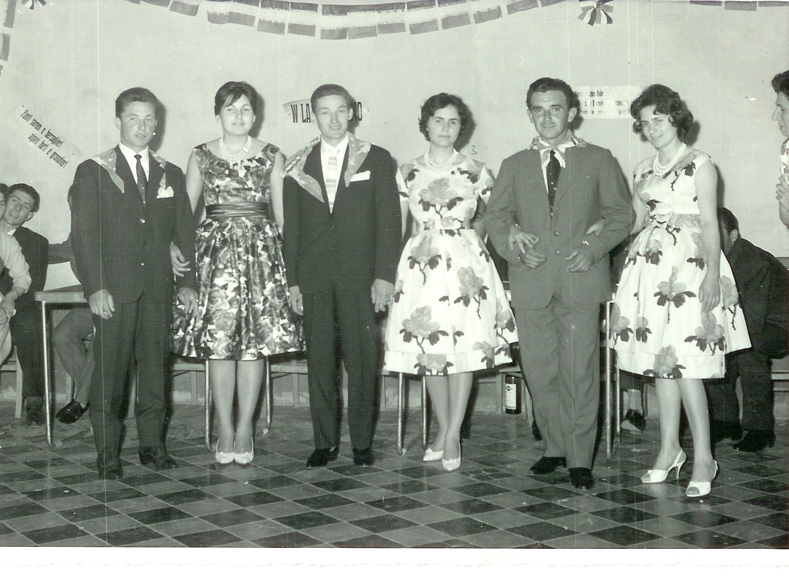 1959: il ballo dei coscritti della classe 1939. Da sinistra, in primo piano: Bruno Cartasegna, Anna Maria Mogni, Luigi (Gigetto) Chiesa che balla con Rita Mogni. In secondo piano, sulla sinistra: Graziella coniugata Tosonotti (dall'archivio fotografico di Piera Mogni).