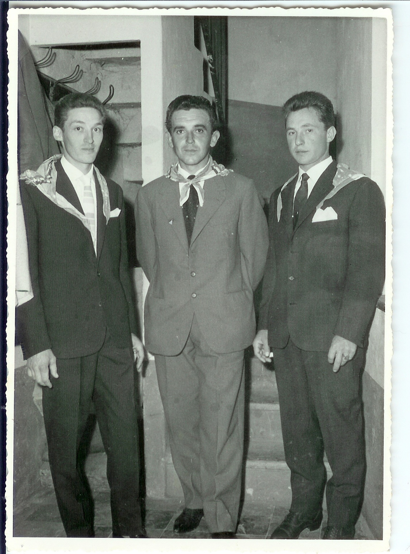 1960: i coscritti classe 1940 sulle scale della sala sociale; da sinistra: Lino Fascetto, Pietro Mogni, Piero Scherpa (dall'archivio fotografico di Lino Fascetto).