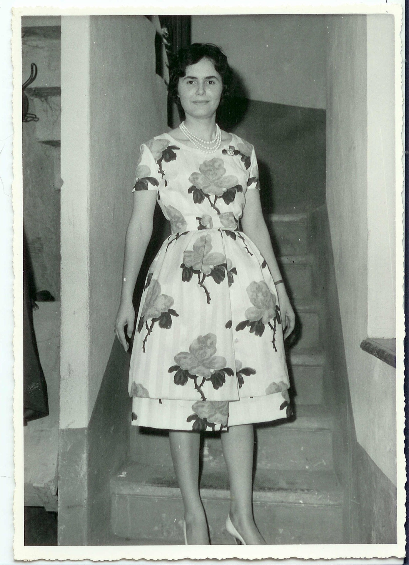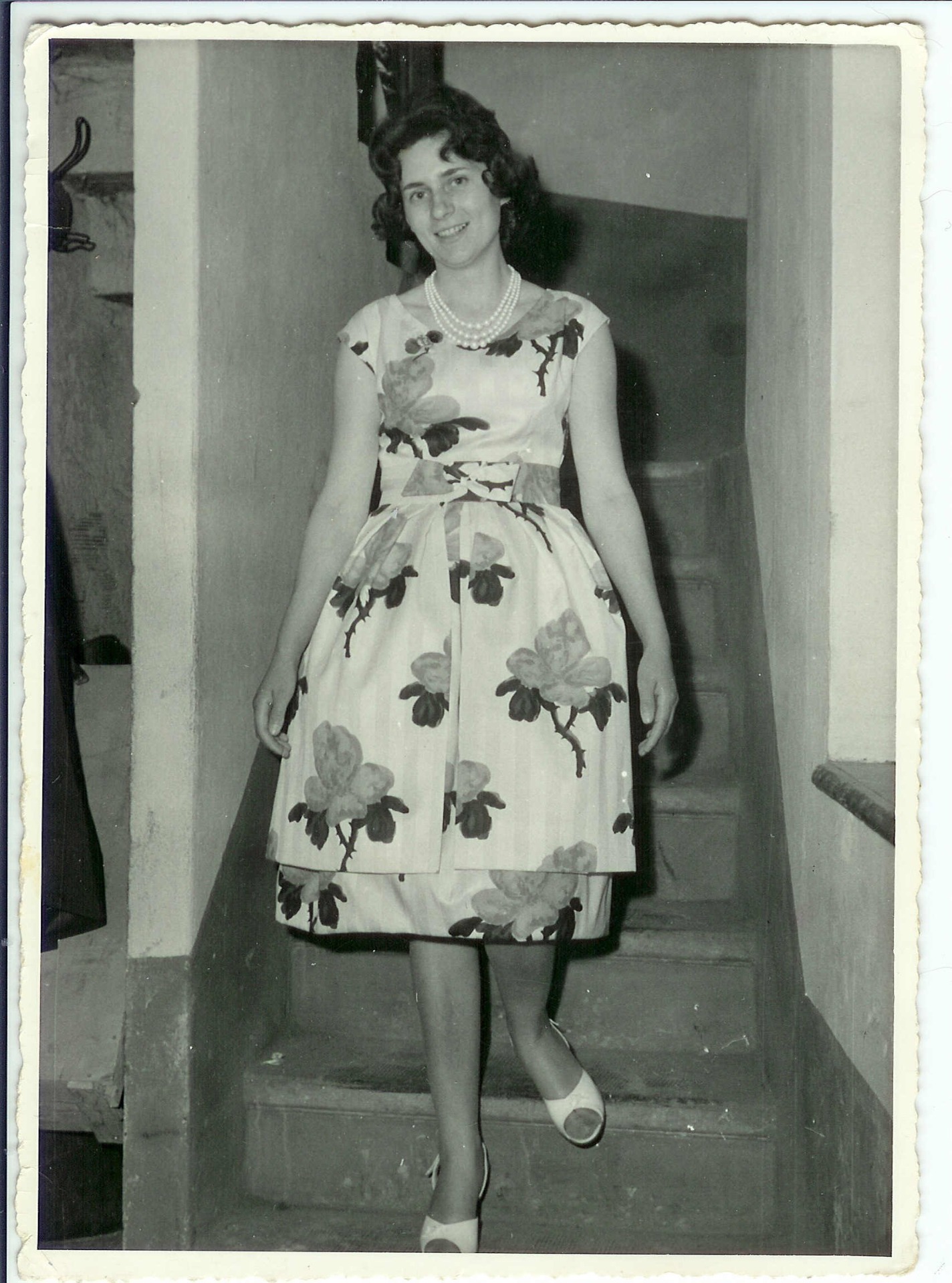 1957, il ballo per la festa dei coscritti classe 1937: Ernestina Boveri davanti alla porta della SAOMS (dall'archivio fotografico di Genesio ed Ernestina Boveri.),