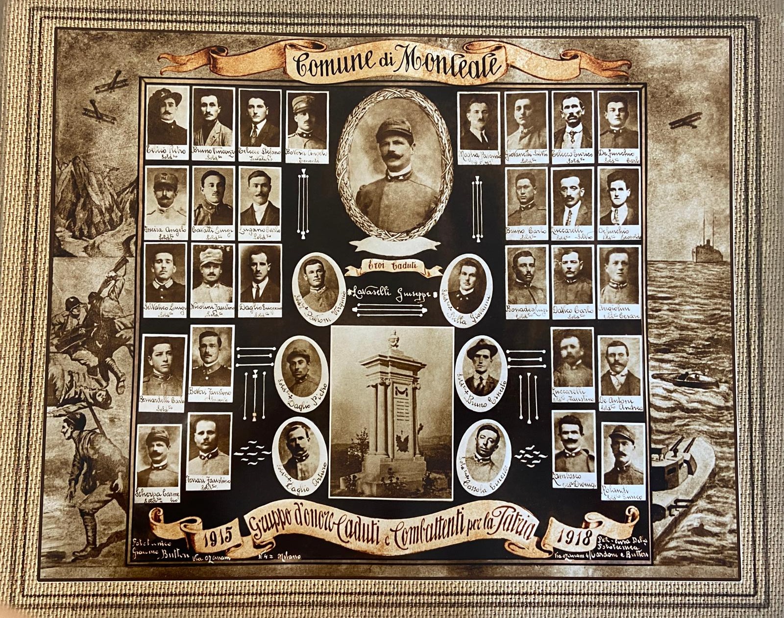 La precedente immagine rappresenta un quadro con foto e nomi dei soldati caduti durante la Prima Guerra Mondiale del Comune di Monleale; al centro si trova anche la foto del monumento ancora oggi visibile in paese, all'incrocio tra Via Teresio Zuccarelli e Strada Costa del Ronco. Il monumento è stato eretto nel sito in cui, fino al 1924, si trovava il cimitero del paese, poi traslato all'esterno dell'abitato, in Strada Costa del Ronco (dall'archivio fotografico di Ruben Rossello).